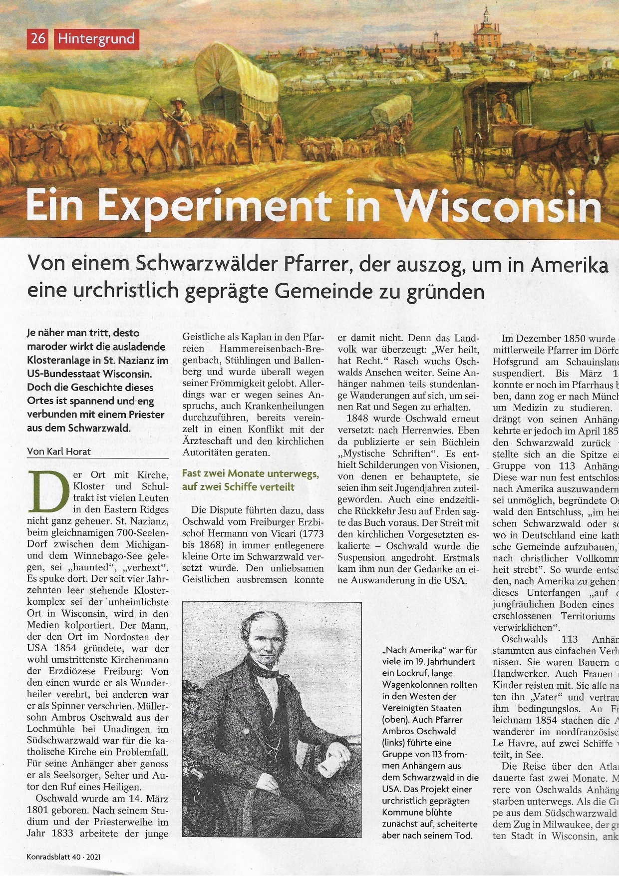Im Dezember 1850 wurde Oschwald, mittlerweile Pfarrer in Hofsgrund am Schauinsland, suspendiert, blieb aber bis März 1852 im Pfarrhaus. Anschließend zog er nach München, um Medizin zu studieren. Gedrängt von seinen Anhängern im Schwarzwald, kehrte er jedoch im April 1854 zurück und stellte sich an die Spitze einer Gruppe von 113 Anhängern, die nach Amerika auswanderten. Dort gründeten sie noch im selben Jahr in St. Nazianz im Bundesstaat Wisconsin eine urchristlich-urkommunistische Kolonie die einzigartig war. Der „Vater“ wie ihn alle nannten, starb „wie ein Heiliger“ am 27. Februar 1873 in Amerika.